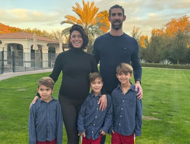 O nadador olímpico Michael Phelps, de 38 anos, e sua esposa, Nicole Johnson, grávida do quarto filho do casal, aproveitaram o Dia de Ação de Graças ao lado dos filhos Maverick, 3 anos, Beckett, 5 anos, e Boomer, 7 anos. Em uma foto ao ar livre, a família sorriu, vestindo camisas azuis e shorts da USC.