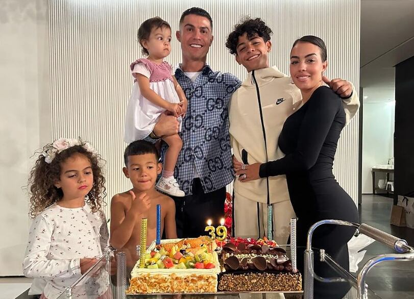 Ao lado de seus quatro filhos e sua parceira Georgina Rodríguez, CR7 posou ao lado das duas sobremesas que tinham velas em homenagem ao seu aniversário. Da mesma forma, em sua residência, ele foi homenageado com dezenas de flores brancas por suas filhas.