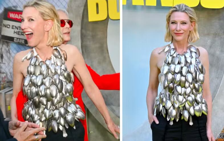 A atriz australiana Cate Blanchett, conhecida por suas escolhas ousadas de moda, surpreendeu a todos ao aparecer em um evento em Los Angeles com um vestido composto por 102 colheres. O look inusitado foi exibido na première do filme “Borderlands: O Destino do Universo Está em Jogo” (2024), onde a atriz quase enfrentou um problema de vestuário que poderia tê-la deixado em uma situação embaraçosa. No entanto, sua colega de elenco, Jamie Lee Curtis, prontamente a ajudou, evitando que o incidente acontecesse.
