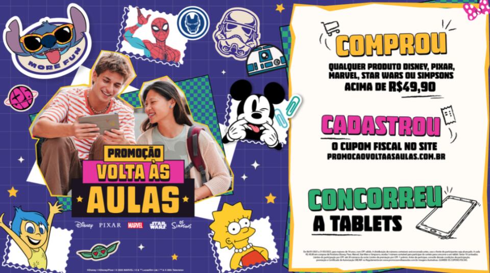A campanha Volta às Aulas 2025 traz a ação “Comprou, Cadastrou e Ganhou”. Os consumidores que adquirirem produtos licenciados Disney, Pixar, Marvel, Star Wars ou Os Simpsons a partir de R$ 49,90 podem cadastrar suas notas fiscais no site oficial da campanha (www.promocaovoltaasaulas.com.br) e concorrer ao sorteio de tablets Samsung TAB S6.