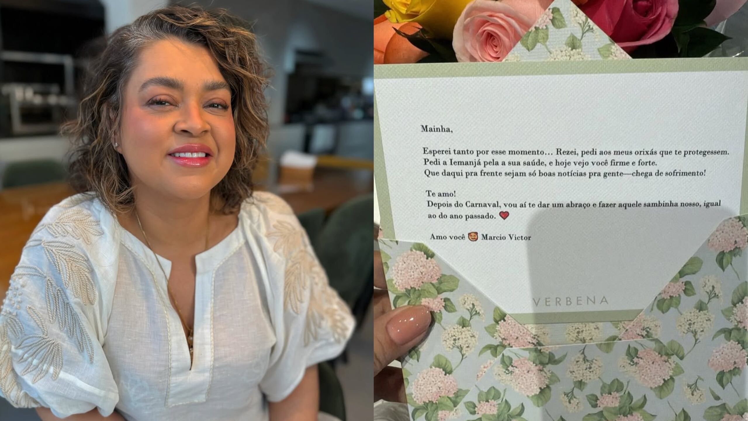 “Esperei tanto por esse momento… rezei, pedi aos meus orixás que te protegessem. Pedi a Iemanjá pela sua saúde e hoje vejo você firme e forte. Que daqui pra frente sejam só boas notícias para a gente — chega de sofrimento! Te amo”, diz a carta.