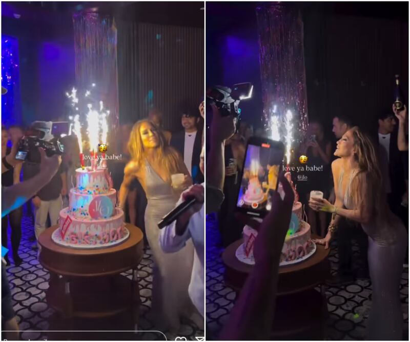 Cercada por amigos, dançarinos e um bolo monumental de três andares coroado com as letras “J.Lo”, a cantora dançou ao ritmo de seu novo single “Birthday”, segurando um copo em uma das mãos e movendo os quadris no ritmo. O momento viralizou não apenas por sua energia, mas também pelos comentários que gerou.