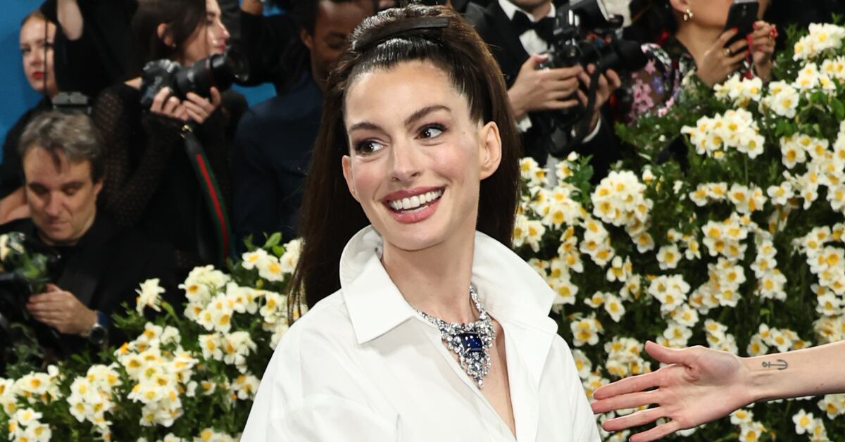 A estrela de ‘O Diabo Veste Prada’ reafirmou por que é considerada um ícone moderno do glamour. Para a ocasião, Hathaway usou um look Balenciaga que reinterpretou uma peça casual com um toque dramático: uma camiseta gráfica que, ao ser girada, revelava uma cauda de tecido espetacular que ia até o chão. Ela complementou o conjunto com luvas de couro pretas, óculos de sol oversized e uma atitude impecável.