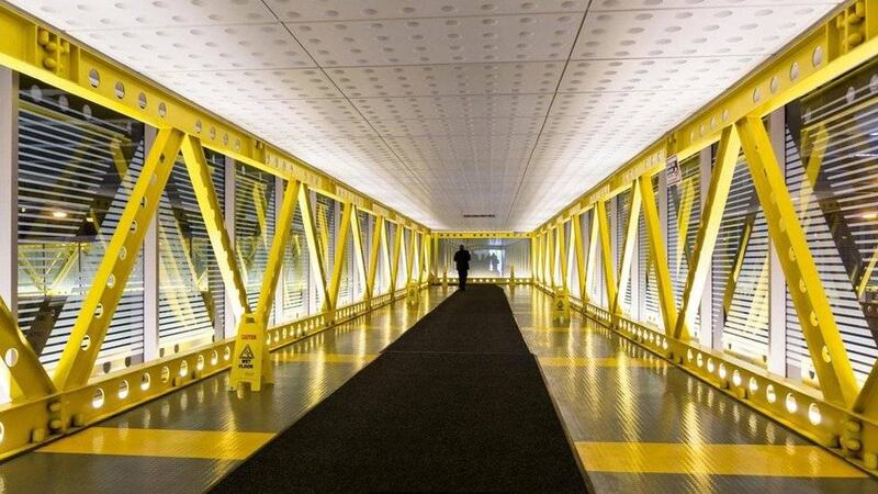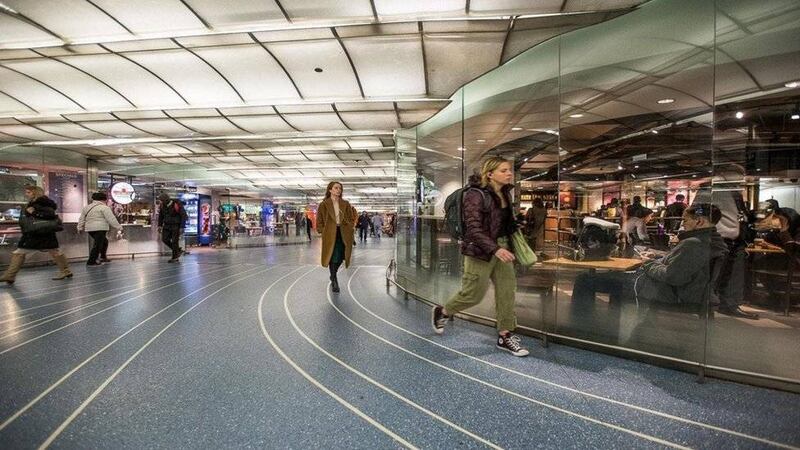 Dentro do centro, atrás da vitrine onde fica a instalação em neon, um elevador mergulha na seção do Pedway construída em 1989.