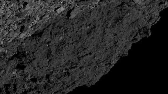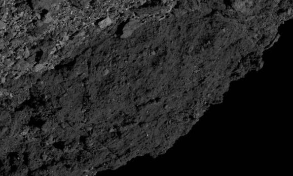 O arquivo mostra uma região de regolito escuro no asteroide. Quando a imagem foi tirada, a espaçonave foi posicionada sobre o hemisfério norte de Bennu, olhando para o sul sobre o bojo equatorial. Confira: