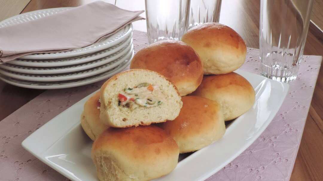 Pegue porções médias da massa e abra com a mão, recheie com a mistura de frango e feche modelando bolas. Coloque os pães, um ao lado do outro, em uma fôrma grande, untada e enfarinhada, e deixe descansar por mais 30 minutos.