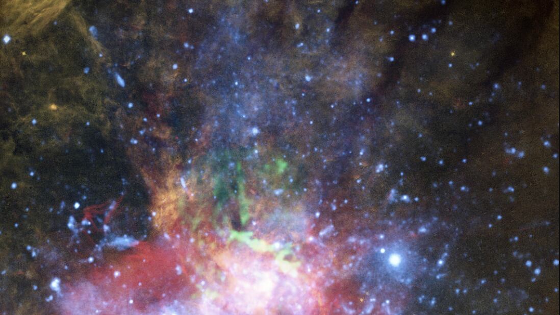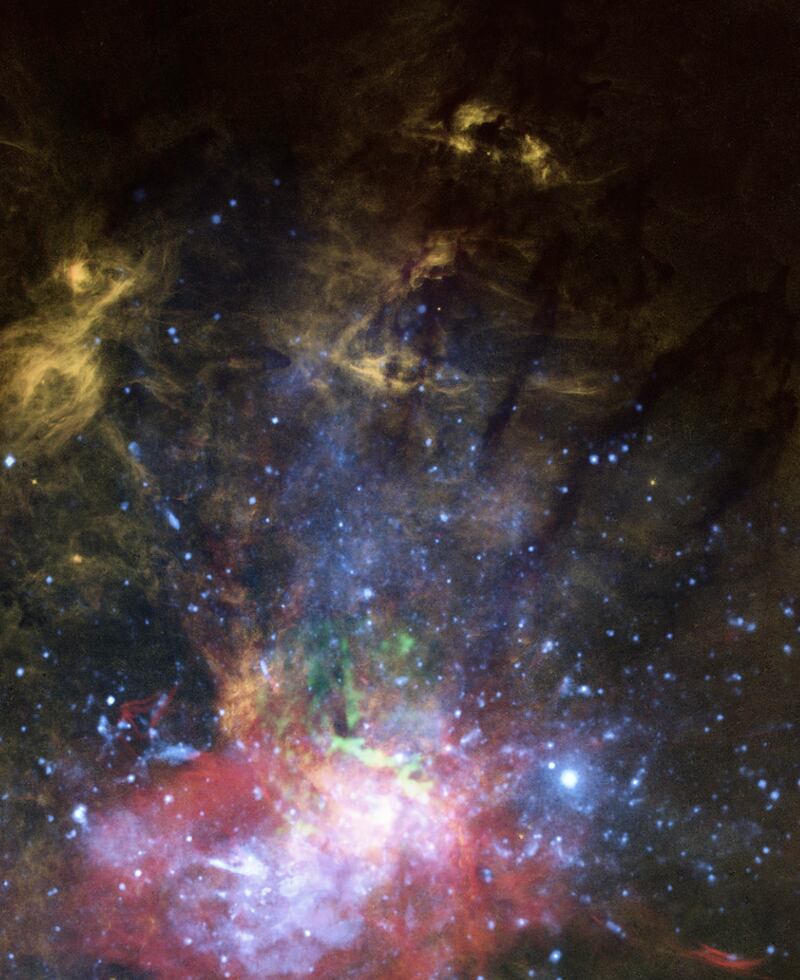 Como detalhado pela NASA, esta imagem composta é de raios-X, gás molecular e gás ionizado quente perto do centro galáctico. As características de cor laranja são de gás hidrogênio brilhante.
