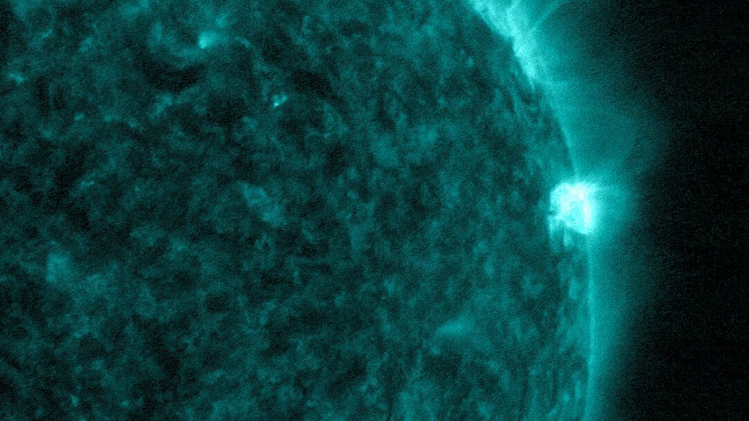 O fenômeno é visto como um flash brilhante no lado direito da imagem Um subconjunto de luz ultravioleta destaca o material extremamente quente em chamas.