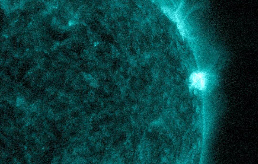 O fenômeno é visto como um flash brilhante no lado direito da imagem Um subconjunto de luz ultravioleta destaca o material extremamente quente em chamas.