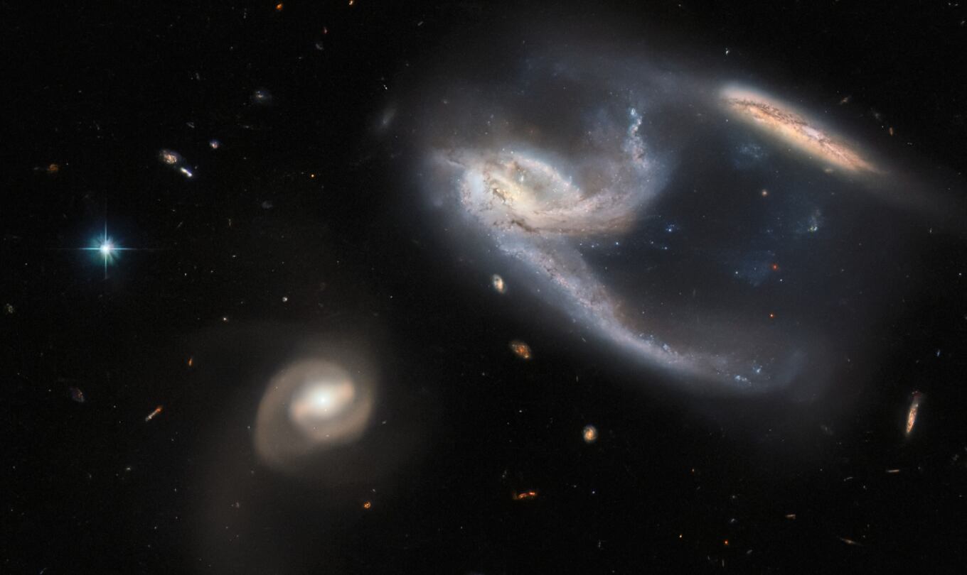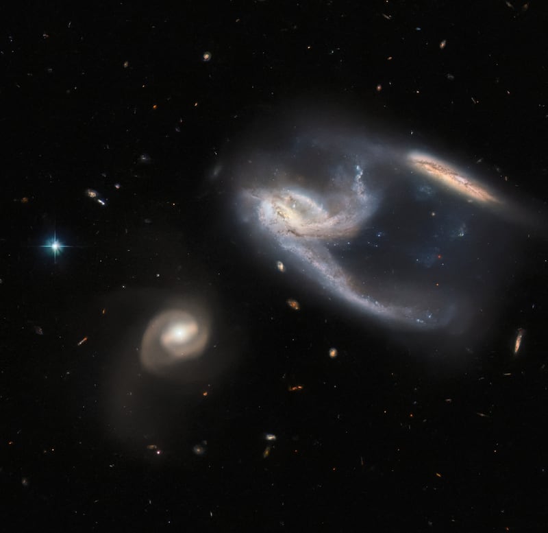 “Na realidade, as interações entre as galáxias acontecem em períodos de tempo muito longos, e as galáxias raramente colidem de frente umas com as outras. Também não está claro se a galáxia no canto inferior esquerdo está interagindo com as outras duas, embora estejam tão relativamente próximas no espaço que parece possível que estejam”, detalhou.