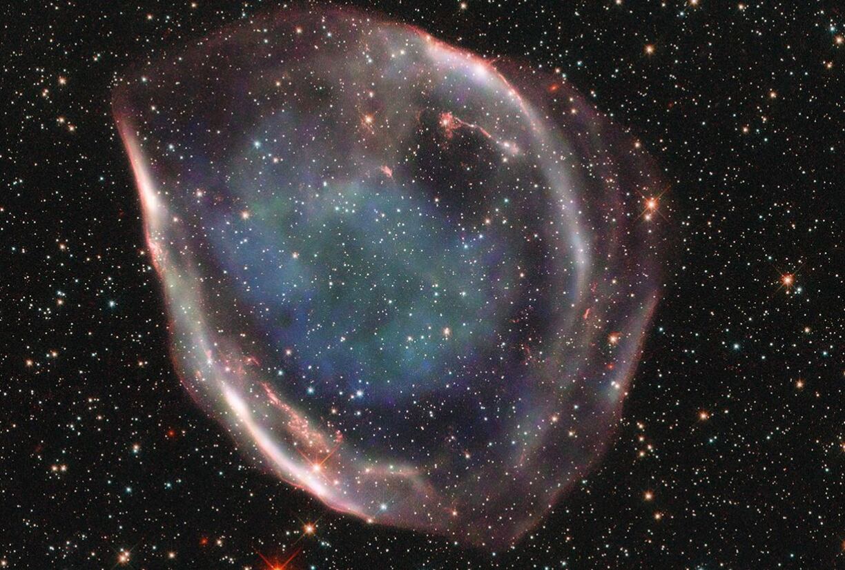 A onda de explosão externa tem aproximadamente 60 anos-luz de diâmetro e foi criada durante a destruição da estrela anã branca.