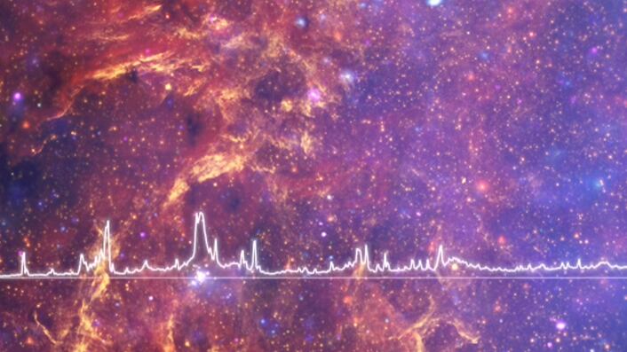 Estrelas e fontes compactas são convertidas em notas individuais enquanto nuvens extensas de gás e poeira produzem um drone em evolução.