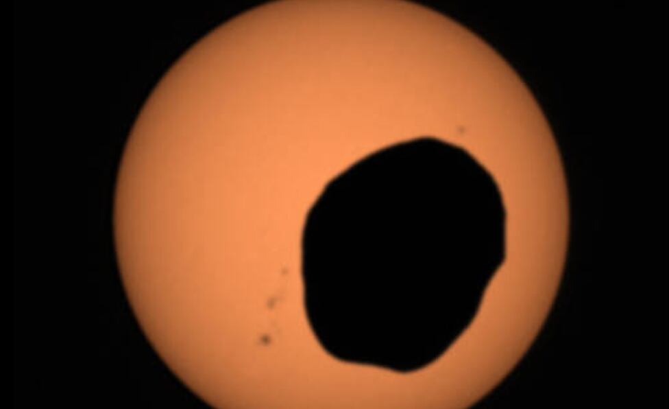 O rover Perseverance Mars da Agência Espacial Americana (NASA) capturou imagens dramáticas de Phobos, a lua em forma de batata de Marte, cruzando a face do Sol.