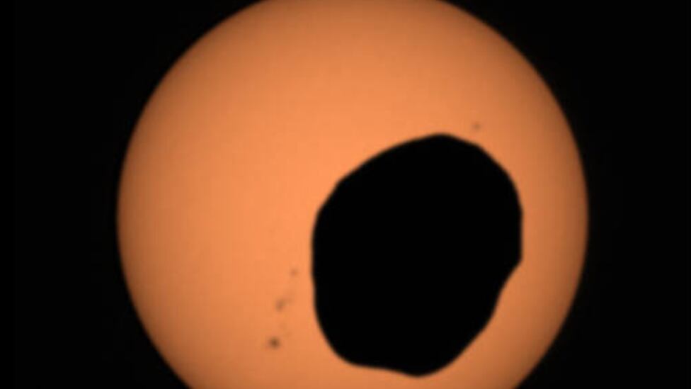O rover Perseverance Mars da Agência Espacial Americana (NASA) capturou imagens dramáticas de Phobos, a lua em forma de batata de Marte, cruzando a face do Sol.