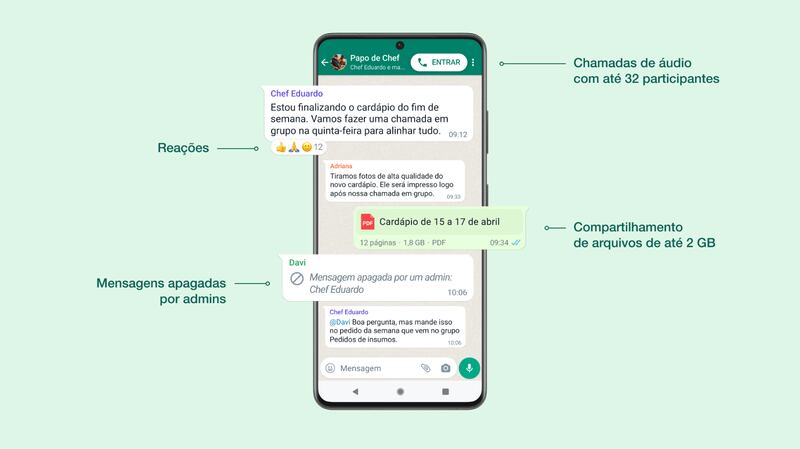 - Mensagens apagadas por admins: admins de grupos poderão apagar mensagens problemáticas ou inadequadas para todos os participantes.