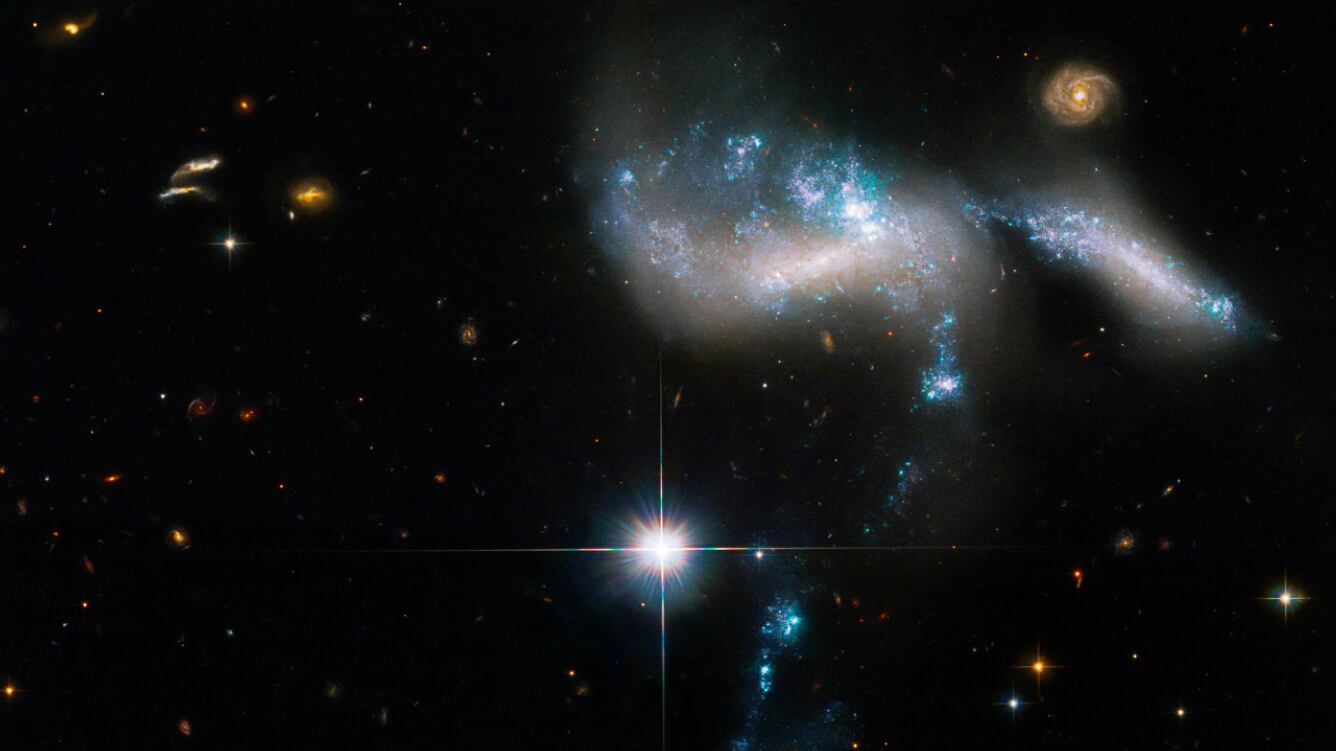 Como detalhado pela NASA, outra galáxia anã, em forma de charuto, à direita do par, junta-se à sua dança com uma fina corrente azul de estrelas que liga o trio.