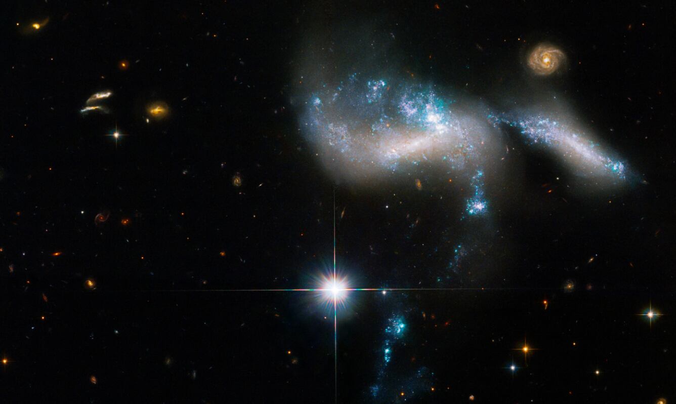 Como detalhado pela NASA, outra galáxia anã, em forma de charuto, à direita do par, junta-se à sua dança com uma fina corrente azul de estrelas que liga o trio.