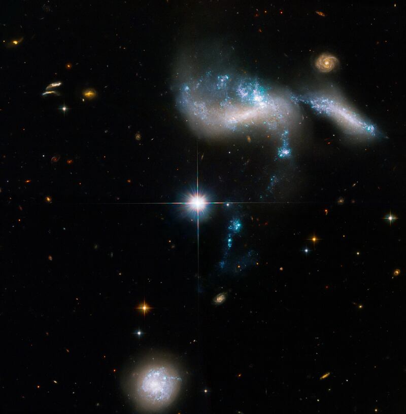 O quarto membro da HGC 31 é revelado por um fluxo de jovens estrelas azuis que apontam para a galáxia (canto inferior esquerdo do centro) e indicam sua interação com as outras três. O objeto brilhante no centro da imagem é uma estrela situada entre a Terra e o HCG 31.