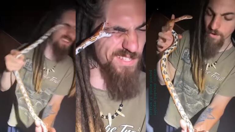 Nas imagens, um homem é visto levando um bote de uma cobra enquanto era filmado. O animal acertou em cheio a região dos olhos e as imagens renderam mais de 24 mil curtidas, no perfil snake._.world.