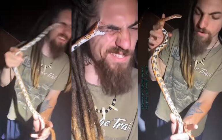 Nas imagens, um homem é visto levando um bote de uma cobra enquanto era filmado. O animal acertou em cheio a região dos olhos e as imagens renderam mais de 24 mil curtidas, no perfil snake._.world.