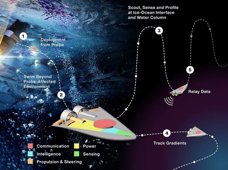 Em linhas gerais, os robôs seriam incorporados em uma sonda que derrete gelo e afunda através da camada de gelo dos planetas com vários quilômetros de espessura, antes que um mecanismo os libere debaixo d’água para fazer medições da temperatura do planeta.