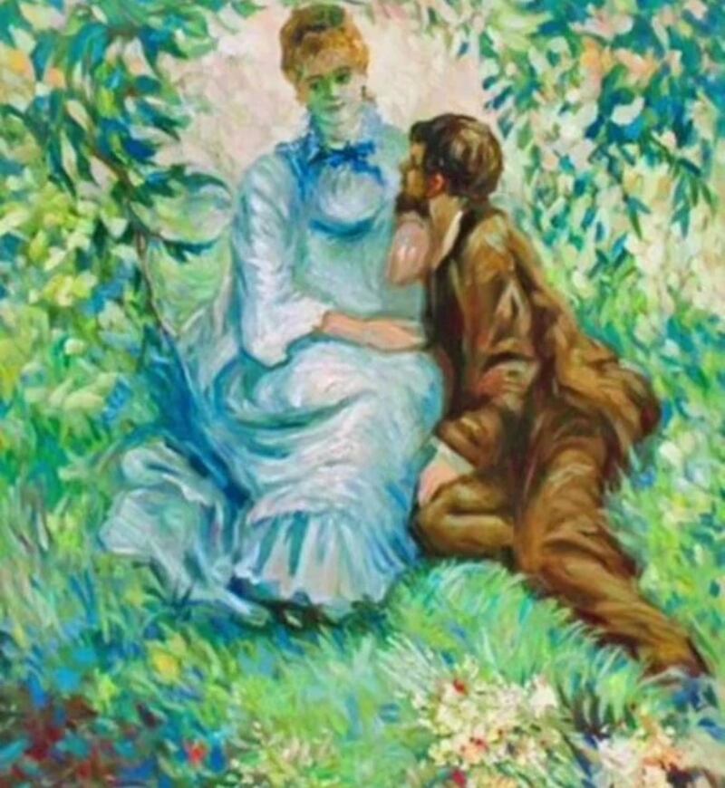 Um rosto? Sim, do lado esquerdo da ilustração, as folhas e o vestido da mulher compõem um rosto de olhos fechados. Conseguiu ver logo de primeira?