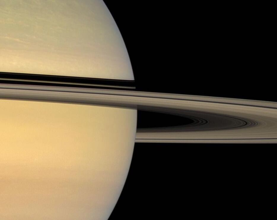 Como detalhado pela NASA, na imagem, o perfil de Saturno domina a imagem de forma longa. A parte do planeta que é visível parece lisa com listras claras de um tom dourado suave.