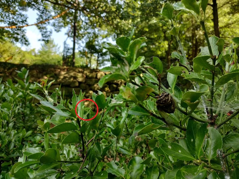 Se ainda não o localizou, vamos te dar uma dica bem valiosa que irá facilitar um pouco. Mas ainda assim o desafio continuará difícil, tudo bem? Agora preste atenção dentro do quadro vermelho, pois é lá que o louva-deus está. Tente mais uma vez!