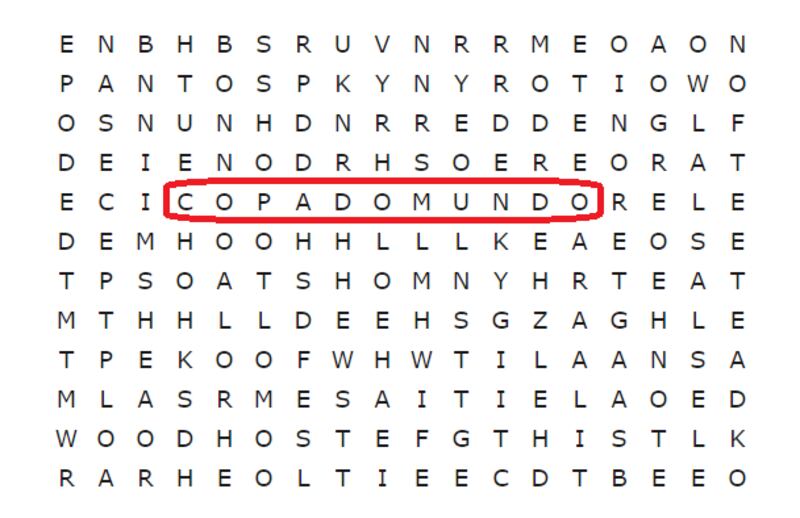 Em época de esporte, testes de percepção não podem ficar de fora e são completamente bem-vindos, quando se deseja descobrir a existência de um olhar aguçado. Para verificar isso, você pode entrar neste desafio e procurar onde está localizada a palavra “Copa do Mundo” na imagem abaixo. Confira: