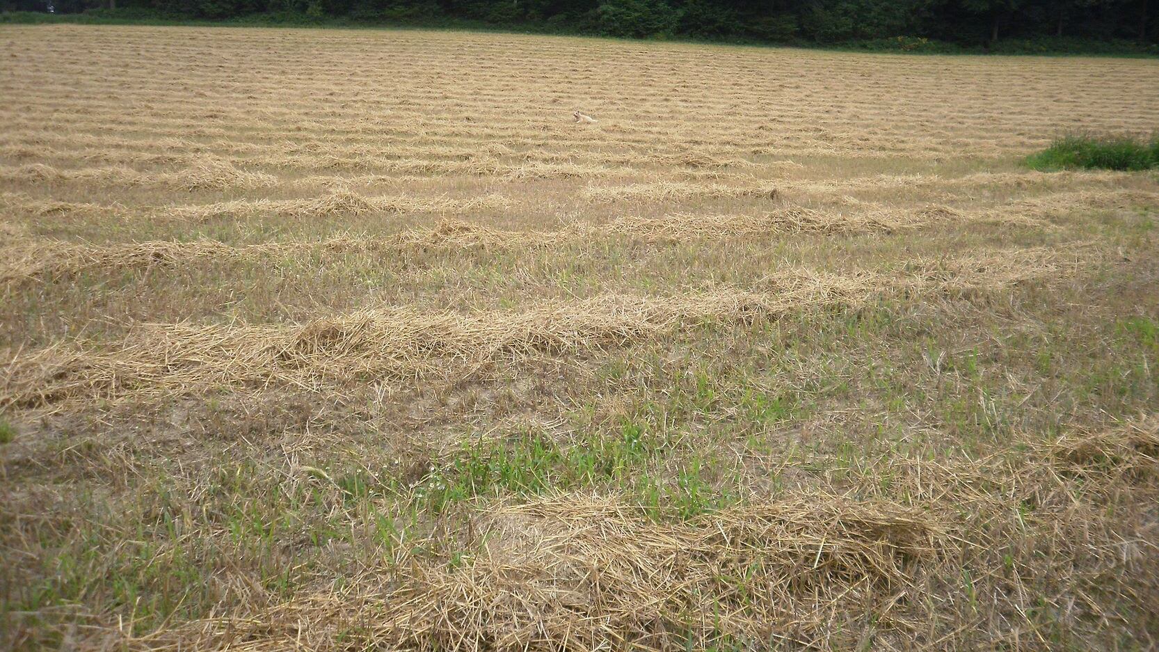 Na foto, é possível ver um campo vasto com muitas palhas sob o solo e diversas árvores no fundo. Porém, há um cachorrinho no meio de toda esta paisagem que precisa ser localizado. Será que você consegue encontrá-lo? Observe bem a imagem abaixo: