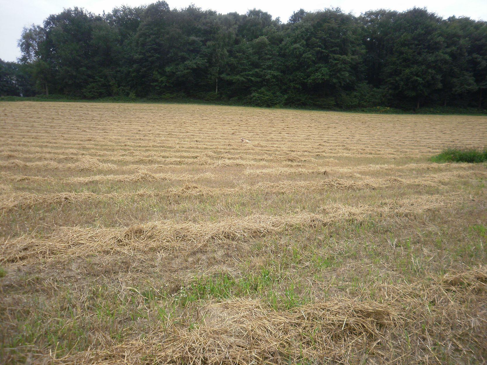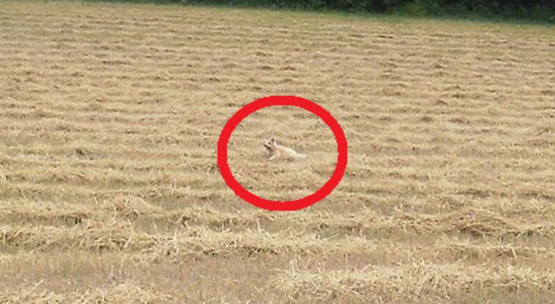 Na foto, é possível ver um campo vasto com muitas palhas sob o solo e diversas árvores no fundo. Porém, há um cachorrinho no meio de toda esta paisagem que precisa ser localizado. Será que você consegue encontrá-lo? Observe bem a imagem abaixo: