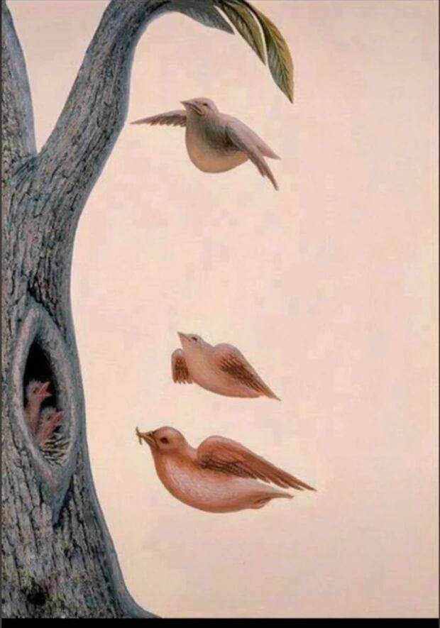 Os pássaros, juntamente com a árvore, fazem uma composição que, caso vista de longe, lembra o rosto de uma mulher. Se essa foi sua primeira percepção deste desenho, é bem provável que você procura pelo amor.