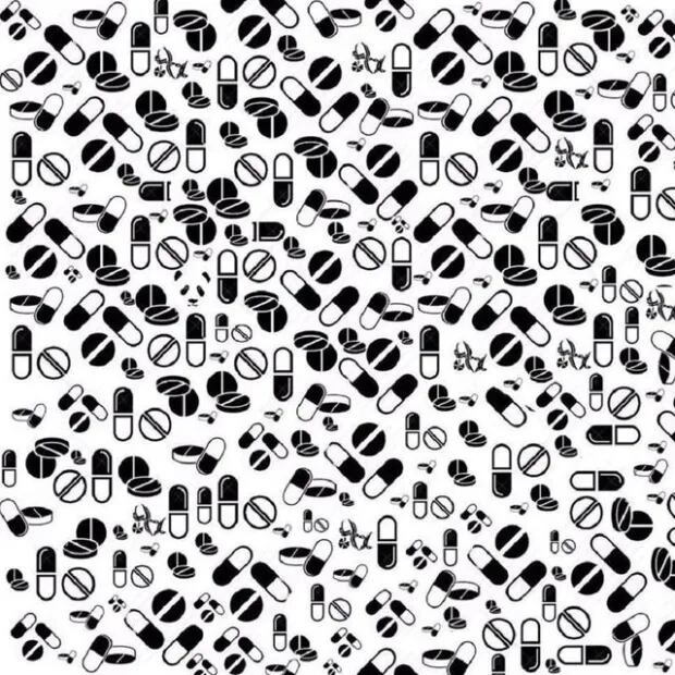 O desafio visual que fecha esta semana é tão simples que nem cores tem, para não causar distrações. Entre tantos comprimidos, há um panda escondido.