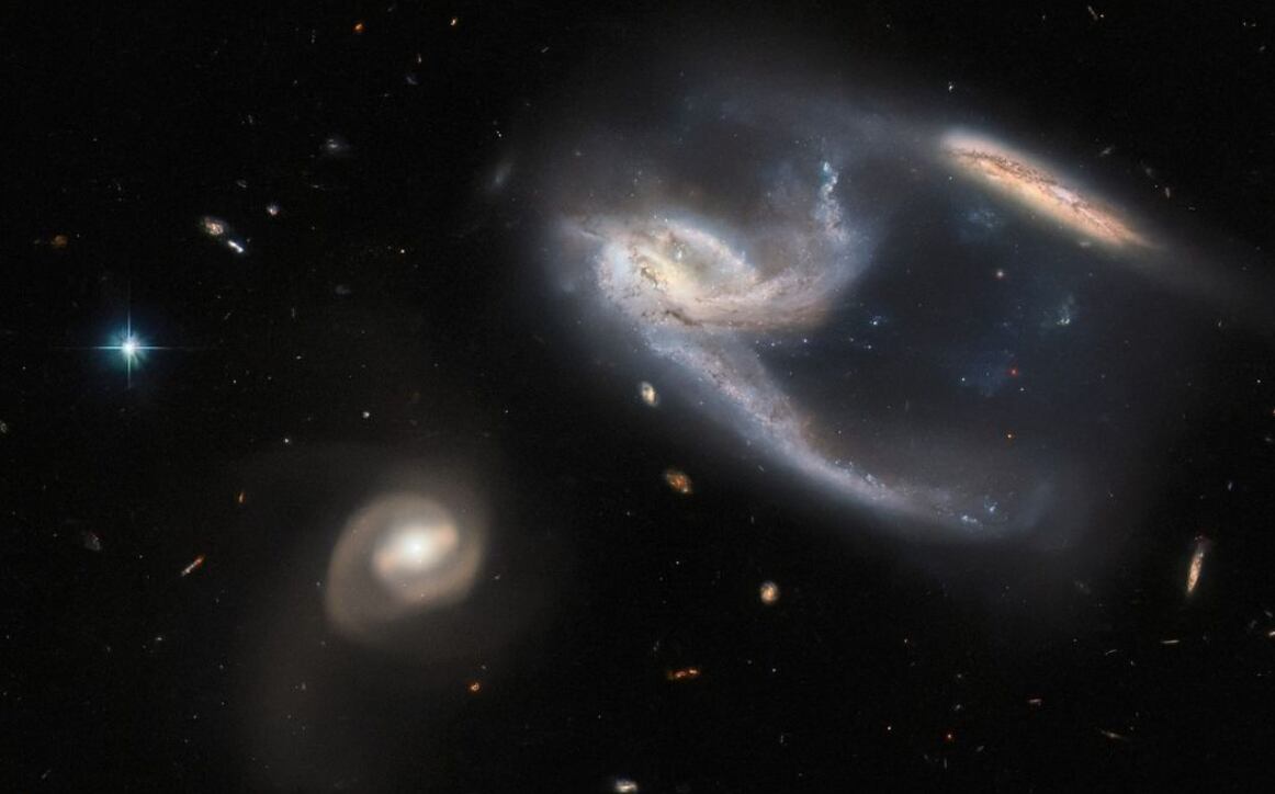 As duas galáxias mais à direita estão interagindo uma com a outra, criando uma forma que lembra a nave estelar Enterprise de Star Trek, no registro captado pelo Hubble.