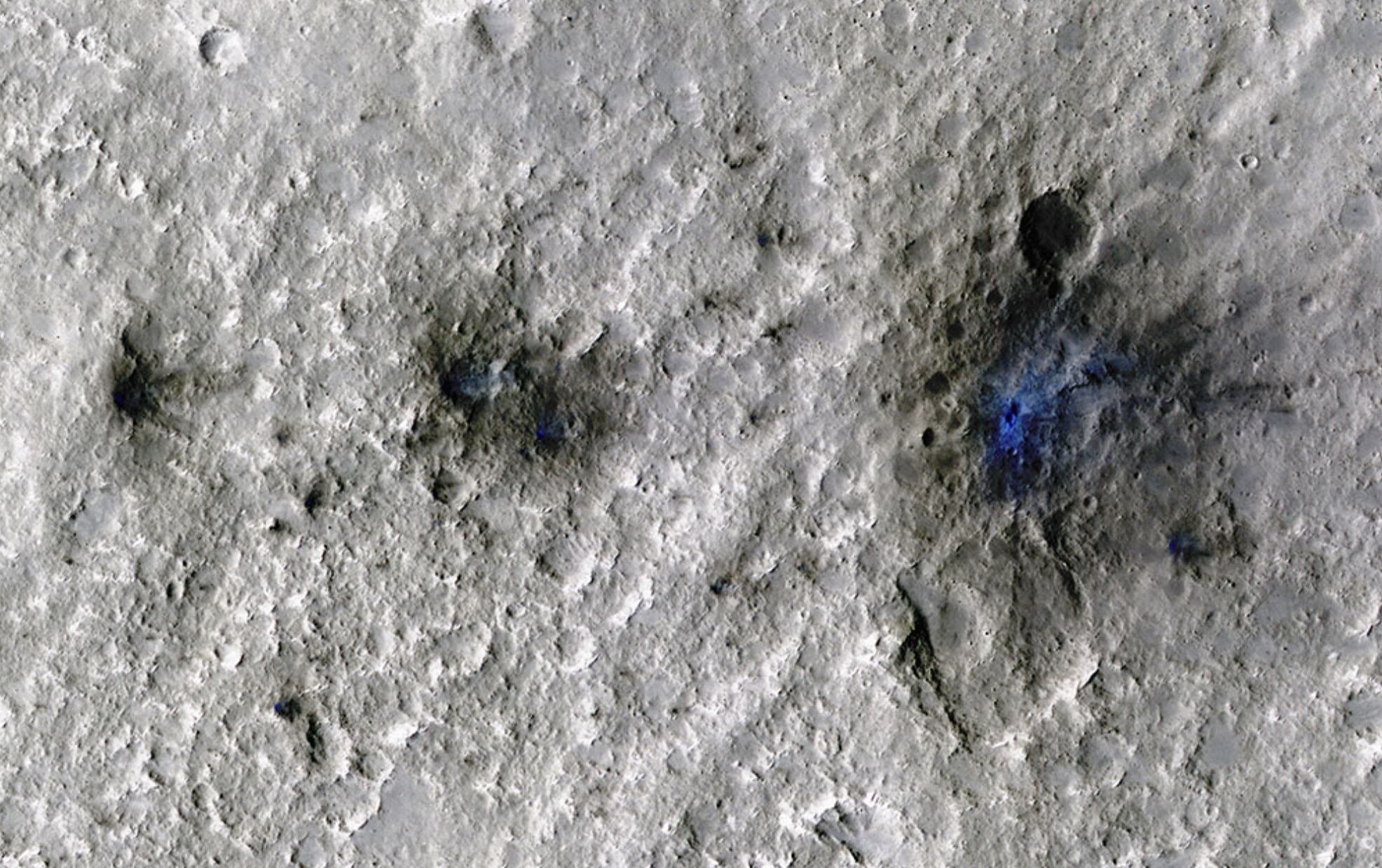 Então, o Mars Reconnaissance Orbiter da NASA sobrevoou o local de impacto estimado para confirmar a localização. O orbitador usou sua câmera de contexto em preto e branco para revelar três pontos escuros na superfície. Depois de localizar esses pontos, a equipe do orbitador usou a câmera HiRISE, para obter um close colorido das crateras.