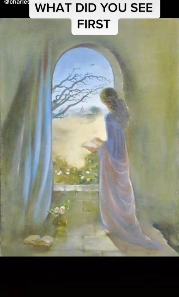 Já a outra alternativa para esta ilusão de ótica é uma mulher de vestido branco, encostada na janela olhando para o lado de fora. Ela poderia ser confundida com uma cortina.