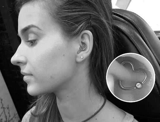 Assim como os de outros formatos, os piercings em formato de coração caem super bem na parte superior da orelha. O destaque neste caso é para o duplo arco que fica evidente.