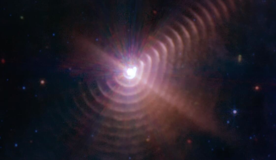 Webb observou WR 140 com seu Mid-Infrared Instrument (MIRI), projetado para ver objetos mais frios como esses espetaculares anéis de poeira.