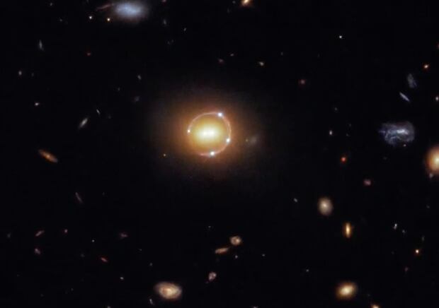 Como detalhado pela NASA, o quasar, conhecido como 2M1310-1714, aparece como cinco pontos devido à lente gravitacional.