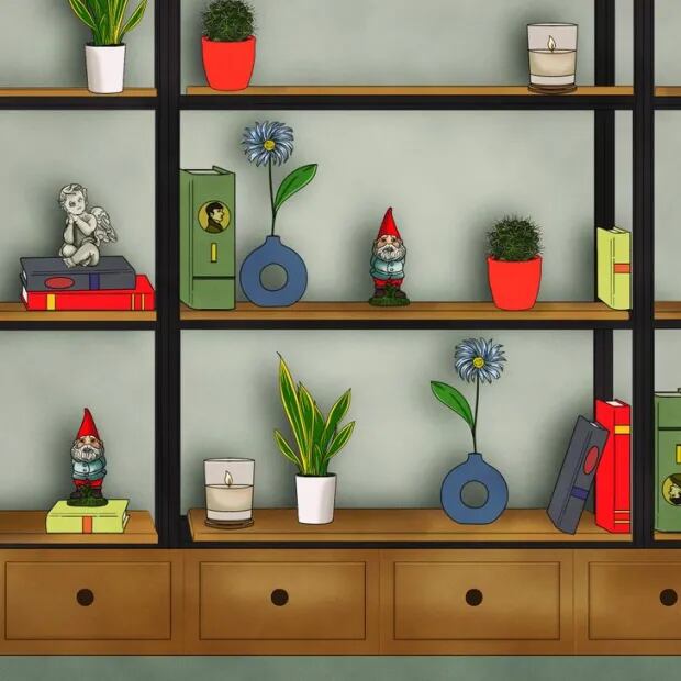 Nesta aqui, o desafio é descobrir a quebra de padrão desta ilustração: tem um item faltando na estante.