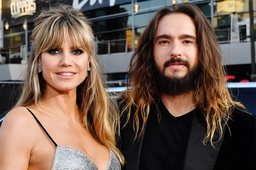 Klum compareceu à estreia com o marido, o músico Tom Kaulitz, que combinou com ela em um terno prateado metálico.