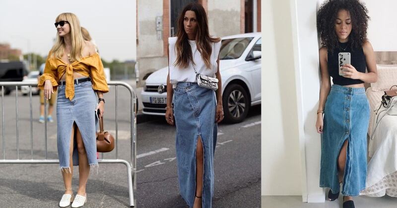 No exemplo acima, o jeito que ela está usando uma saia longa deixa o corpo mais longo e magro. O segredo para obter esse efeito, é utilizar uma saia longa com fenda, para que você possa exibir suas pernas, além de ser mais confortável. As saias jeans estarão com tudo em 2023 - como sempre.