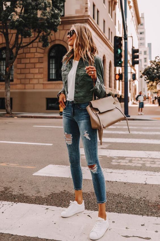 Para um look mais inspirado em garotas francesas, opte por um par de sapatilhas. Você provavelmente já possui um ou dois pares com base na popularidade deles no momento, então, basta combinar com o jeans do dia.