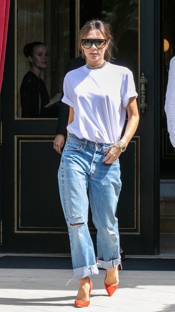 Poucas coisas combinam tão bem quanto jeans largos e um blazer igualmente largo. A adição de um sapato com cor marcante adiciona um fator “uau” que parece fácil de ter.