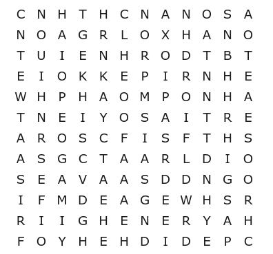 Se concluiu o caça-palavras sem consultar o resultado, saiba que fez um belo trabalho! Caso contrário, não se preocupe. Afinal, este não é um teste tão simples. Abaixo você confere a resposta do desafio: