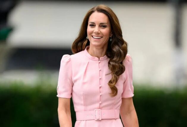 Kate Middleton usou um vestido rosa claro da marca Beulah com botões na frente, que apresentava um decote alto e estava com a cintura marcada com cinto. Se a roupa parece familiar, é porque ela a usou anteriormente em Wimbledon, em 2021.