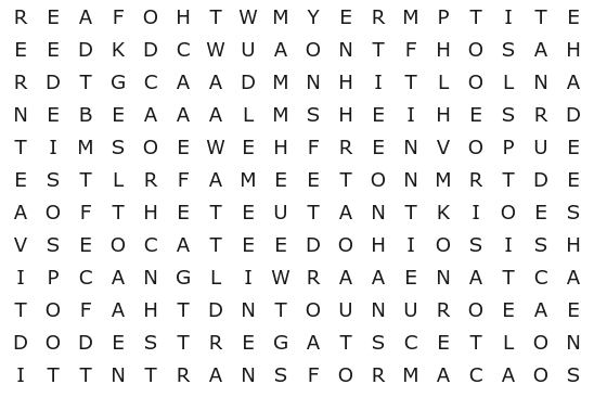Apenas os craques em testes como este podem concretizá-los antes de os segundos se acabarem. Você é capaz de localizar as palavras “mudança” e “transformação” no caça-palavras em apenas 24 segundos? Observe bem no quadro abaixo:
