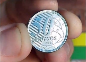 De acordo com o catĂĄlogo de moedas brasileiras, se a moeda de 50 centavos com a letra âAâ apresentar o reverso rotacionado em 180Âș em relação ao anverso, ela pode valer entre os colecionadores R$ 1.200.