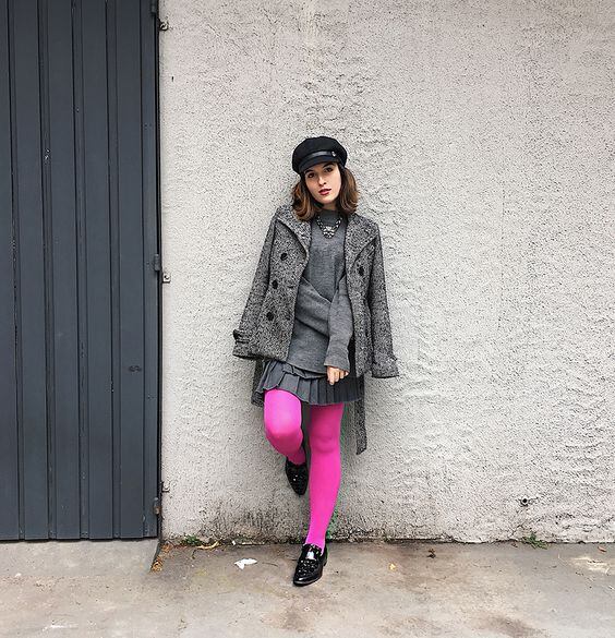 Para aqueles dias em que você está se sentindo um pouco enjoada de usar preto, mas também sente que não tem outra escolha, vista uma meia-calça colorida (que tal uma pegada Barbiecore?) para dar um toque especial em seu visual habitual do dia.