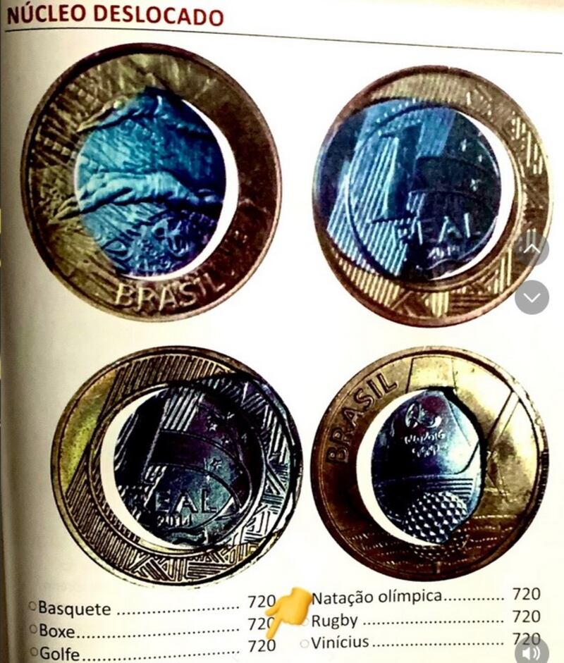 Além da moeda de natação, outras moedas olímpicas que valem R$ 720 caso apresente o núcleo deslocado são: basquete, boxe, golfe, rugby e do mascote Vinícius.